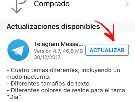 - Allí, tienes que buscar Telegram y mirar a tu derecha . Si tu versión de la aplicación es antigua y hay una más reciente, verás un botón con el texto » Actualización «. Lo único que queda por hacer es pulsar sobre él y esperar, tu teléfono recibirá los archivos necesarios e instalará la actualización. ¡Hecho! .