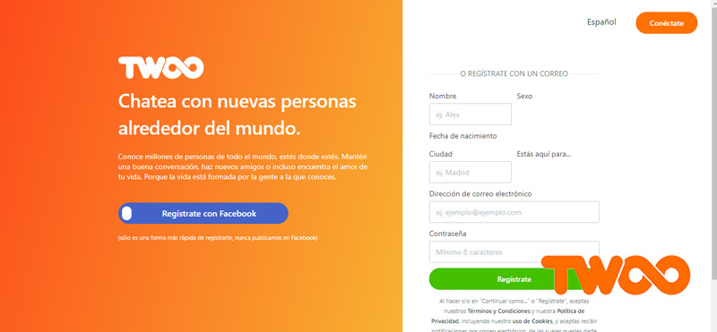 Básicamente, el Twoo es una red social dotado de excelentes características para hacer nuevas amistades que, en los últimos años, ha conseguido para reunir alrededor de 71 millones de usuarios registrados en todo el mundo . Si quieres registrarte en esta plataforma, sólo tienes que usar tu correo electrónico para confirmar y también puedes hacerlo a través de tu cuenta de Facebook. Además, puedes añadir en tu perfil todo lo siguiente sobre sus mejores gustos y preferencias para que las personas interesadas en ti puedan conocerte mejor.